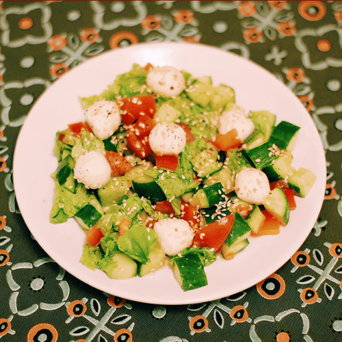 Vegetable salad with mozzarella, sesame and spicy dressing