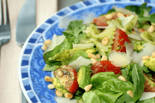 Place a mixture of salad leaves (arugula + lettuce) on a plate, then add farfalle with tomatoes and avocado on top. Sprinkle the salad with grated cheese and remaining pine nuts.