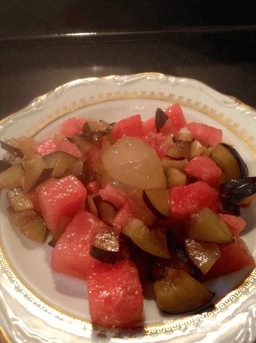 Mix finely chopped plums and cubed watermelon in a ratio of about 50/50.