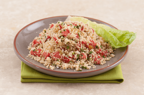 Serve the tabbouleh piled on a plate, garnished with a lettuce leaf.