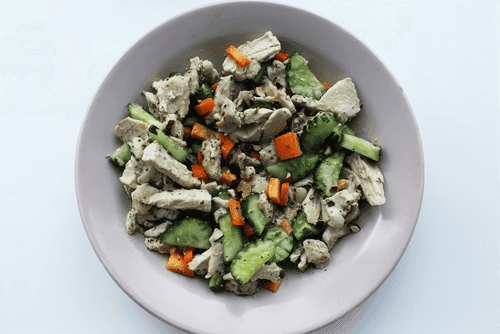 This exquisite salad with chicken and a bittersweet dressing is the embodiment of flavor harmony. Tender chicken fillet baked with aromatic spices creates a rich base, while the freshness of cucumbers and carrots adds lightness. The main highlight is the spicy dressing that combines the warmth of olive oil, honey sweetness, and mustard sharpness, which together with crunchy hazelnuts creates a complex and refined bouquet. This salad is suitable as a light lunch or dinner; it can be served as a standalone dish or as a side to main courses. European chefs value balance in food, and this salad is a wonderful example of gastronomic art that impresses with its simplicity and depth of flavor nuances.