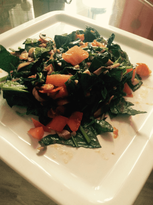 Heat olive oil in a pan and add finely chopped mushrooms, then add the other 2 finely chopped tomatoes 5 minutes before they are done. After a few minutes, add some spinach leaves and crushed garlic. Cook everything until ready.