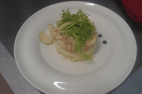 On a flat round plate with a diameter of about 10 cm, we first layer sliced cucumber, pressing it slightly with a spoon; second layer is grated egg, also pressed down; third layer is the main mass of shrimp and crayfish tails, then we remove the ring. We garnish with arugula (optionally, can be decorated with a sliced lime circle).