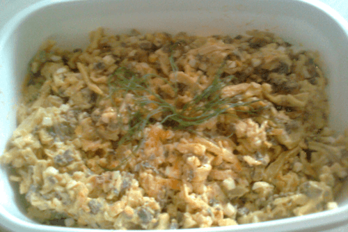 For pancakes, knead the dough from 1 egg, sour milk (or kefir), flour, a pinch of salt, and yeast. Add mustard and spices to your liking (I added khmeli-suneli and crushed dried dill with crushed dry dill flowers). Bake thin pancakes. It is preferable not to brown them. No more than 5 pancakes will go into the salad.