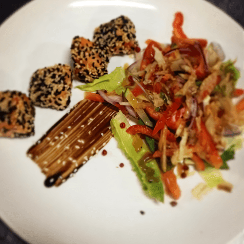 Warm salad with salmon and unagi sauce is a harmony of textures and flavors, combining tender salmon, crunchy vegetables, and a spicy Eastern sauce. This dish incorporates elements of Japanese and European cuisine, creating a perfect balance between freshness and richness. The sesame-crusted salmon gains a golden crust and nutty aroma, while the sautéed vegetables add depth of flavor to the salad. The unagi sauce adds a sweet-salty caramel note, turning the dish into a gastronomic delight. Such a salad is suitable as a light standalone dish or an elegant appetizer that can impress guests with its exquisite taste and presentation.