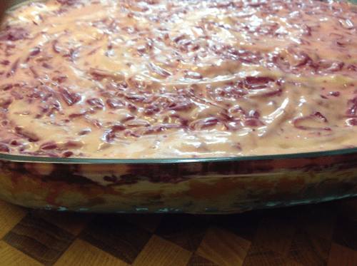 Also, layer herring, onion, carrot, and beet on top. Spread mayonnaise on all layers.