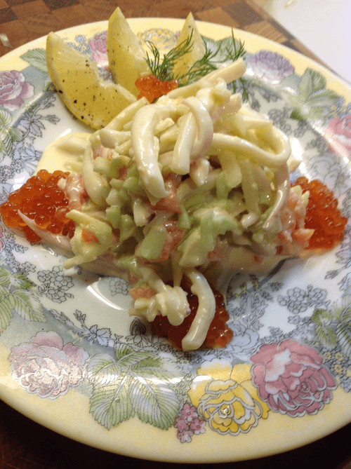 Seafood salad with squid and salmon is an exquisite dish of European cuisine that combines the freshness of seafood, the tenderness of salmon, and the crunchy texture of vegetables. The history of such salads originates from Mediterranean culinary traditions where seafood played a key role. The taste elegantly balances between the light acidity of apples and lemon juice, the tenderness of squid, and the richness of salmon. Red caviar adds spiciness and a refined texture. Dressed with a sauce made from mayonnaise and melted cheese, the salad acquires a creamy consistency. This salad is perfect for a festive table; served chilled with caviar and a slice of lemon, it will adorn a gastronomic evening. The dish not only delights in taste but is also healthy due to seafood rich in protein and trace elements.