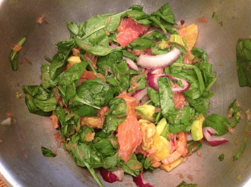 In a large bowl, mix young spinach leaves, citrus slices, avocado, onion, and thinly sliced salmon or any other red fish cut similarly. If you can't buy cold-smoked fish, you can use lightly salted. However, it's easier to cut smoked fish as it holds its shape better.
