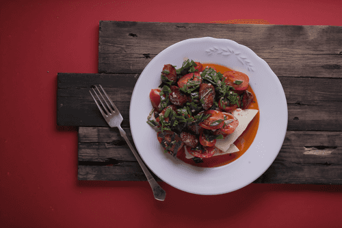 Chop the tomatoes and all the greens coarsely, mix them, and season with salt, pepper, olive oil, and half of the balsamic vinegar. Mix again.