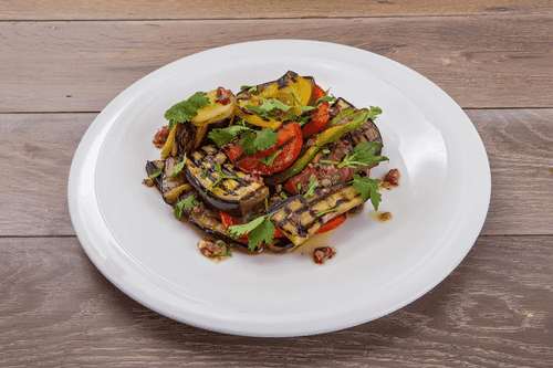 Grilled vegetable and herb salad is the essence of summer flavors and Mediterranean aromas. Historically, such dishes emerged to highlight the freshness of seasonal products and their simple preparation. Grilled eggplant, sweet peppers, and tomatoes acquire a deep, rich flavor with a hint of smokiness, while a dressing of spices, garlic, lemon juice, and olive oil adds zest and refreshing acidity. The addition of basil and cilantro enhances freshness and makes the salad a perfect complement to meat and fish dishes as well as a light dinner on its own. This salad is a true ode to summer, warmth, and gastronomic delight.