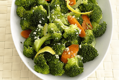 Boil broccoli for 5 minutes, place in cold water for 1 minute, drain, cut carrot into large sticks, fry for 2 minutes in sunflower oil, add garlic, chili pepper, salt.