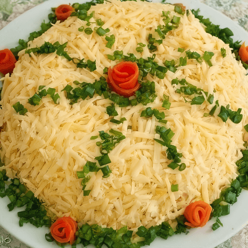 Salad 'Festive' with cheese is a true decoration of any celebration. Its roots go back to Russian cuisine, where the combination of simple yet hearty ingredients is traditionally valued. Tender chicken fillet, juicy carrots, and boiled eggs create a soft texture, while melted and hard cheese adds a rich, creamy flavor. The layered structure of the salad makes it not only attractive but also harmonious in taste: each layer is soaked in mayonnaise, creating a perfect balance of tenderness and slight spiciness. Garnished with greens, it becomes the true centerpiece of the festive table. This salad is perfect for both family gatherings and formal events, delighting guests with its rich flavor and appetizing appearance.