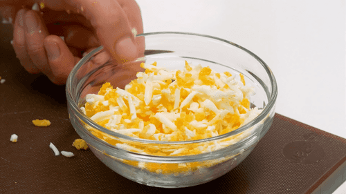 Peel the boiled eggs and grate them on a coarse grater.