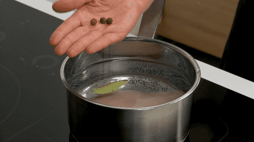 Boil chicken breast with bay leaf and a few peppercorns. Remove the cooked chicken from the broth and keep the broth.