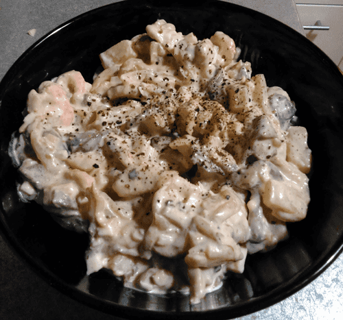 Combine mushrooms, fried onions with chicken, eggs, peeled shrimp, and canned pineapples (without liquid!), and add mayonnaise.