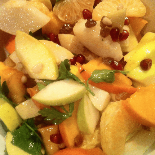 Fruit salad with pomegranate seeds and greens is an exquisite dish that reflects the richness of Arab cuisine. Pomegranate, symbolizing prosperity and well-being, adds brightness and a slight tang to the salad, complementing the sweetness of persimmons, pears, and tangerines. Pine nuts add a delicate creaminess, while light raisins provide soft sweetness. Olive oil unites the flavors, and fresh parsley gives the dish aromatic freshness. This salad is an ideal option for a light snack or festive table.