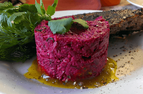 Beet pkhali is a colorful dish of Georgian cuisine that combines the tenderness of boiled beets, the richness of nuts, and the aroma of spices. Historically, pkhali is a traditional appetizer where vegetables are mashed with nuts and herbs to create an incredible blend of flavors. In this version, beets add a light sweetness that perfectly balances the spiciness of the spices and the zestiness of red onion. Imeretian saffron and ucho-suneli reveal a rich palette of Georgian flavors. This dish is served chilled, making it especially fresh and vibrant. It pairs wonderfully with lavash and greens and is an excellent complement to meat and fish dishes. Beet pkhali is not just an appetizer but a piece of Georgian gastronomic culture in every spoonful.