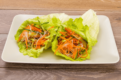 Mix carrots, cucumbers, onions, place on each lettuce leaf, add noodles.