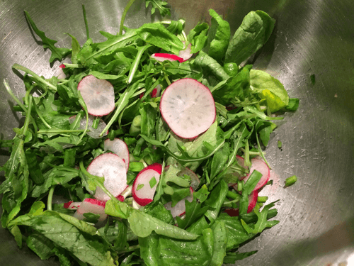 Mix radish, greens, arugula (can be replaced with mizuna), green onion, and mix well.