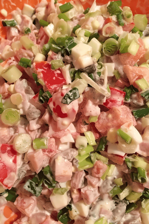 Smoked chicken and mushroom salad is a delightful combination of smoky chicken flavor and tender sautéed mushrooms, complemented by fresh vegetables. Originating in American cuisine, this salad became popular due to its nutritional value and ease of preparation. Bell peppers and tomatoes add brightness to the dish, garlic adds zest, and mayonnaise binds all the ingredients together, creating a creamy texture. This salad can be served as a standalone dish or used as a filling for sandwiches. It is perfect for festive tables or cozy home dinners. Rich in protein and vitamins, the salad is not only tasty but also healthy. The tenderness of the mushrooms, juiciness of the vegetables, and richness of the smoked chicken make it a true gastronomic delight.