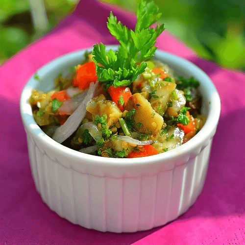 Eggplant and sweet pepper salad is a harmony of flavors and aromas. Roasted eggplants acquire a tender texture and light sweetness, while the pepper adds juiciness and vibrant colors. The light acidity of lemon and balsamic vinegar highlights the taste of fresh vegetables and greens, creating a refreshing summer accent. This dish comes from Russian cuisine, where vegetable appetizers are valued for their simplicity and rich flavor. It can be served as an independent appetizer or a side dish to meat dishes. Thanks to the marinade, the salad gains depth of flavor, revealing new notes after a few minutes of preparation. Such a salad is perfect for a light dinner or festive table, delighting guests with its brightness and spicy nuances.