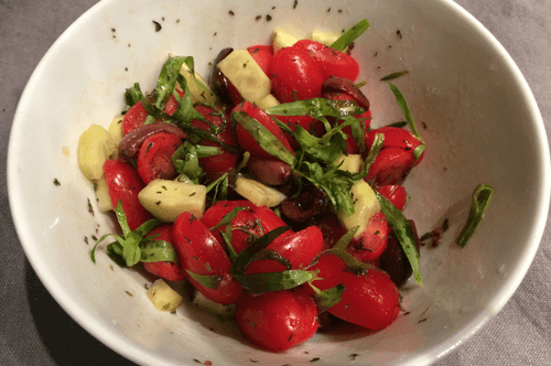 Mix tomatoes, cucumbers, olives, tarragon in a salad bowl and dress with a mixture of olive oil and 1 tablespoon of lemon juice.