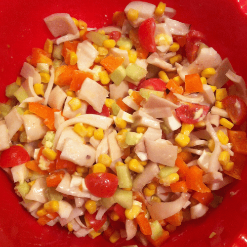 Spring salad with squid is a light and refreshing dish that combines the tenderness of seafood with the juiciness of vegetables. This recipe emerged from culinary experiments, blending traditional ingredients with an author's approach. Squid cooked with bay leaves gains softness and a subtle sea flavor that is beautifully complemented by the freshness of cucumbers, tomatoes, and sweet peppers. The addition of canned corn gives the salad a light sweetness, while chicken eggs make it more filling. Dressed with mayonnaise, it becomes tender and harmonious, suitable for both festive gatherings and everyday dinners. Spring salad with squid is an ideal choice for lovers of exquisite yet easy-to-make dishes.