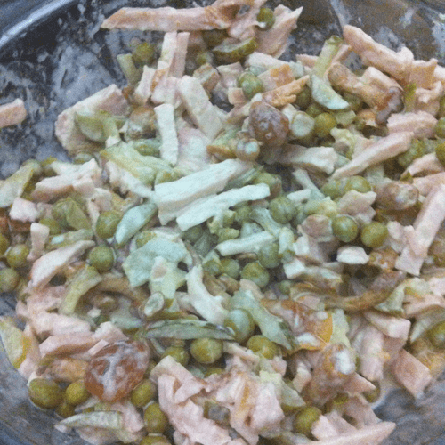 Quick salad with smoked chicken and mushrooms is a harmonious blend of aromatic smoked meat, crunchy cucumbers, and tender pickled mushrooms. Its roots trace back to European culinary traditions where simplicity and rich flavor go hand in hand. Mushrooms add zest while green peas provide a light sweetness. Crunchy croutons add textural contrast, and mayonnaise binds all the ingredients into a cohesive dish. The salad is perfect for quick dinners, festive gatherings, or hearty snacks. It requires no lengthy preparation but delights with its rich taste and appetizing aroma. An excellent choice for those who value convenience without sacrificing gastronomic pleasure.