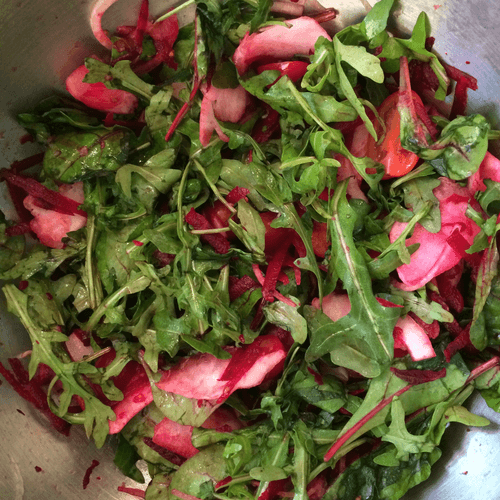 Mix turnip, beetroot, tomatoes, onion, cherry, and salad mix in a salad bowl.