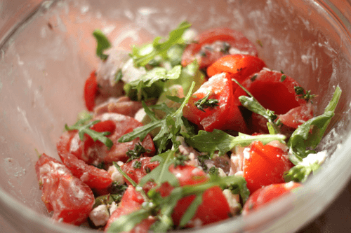 Cube the feta cheese, tear the salad by hand, drizzle with sauce, and add arugula.