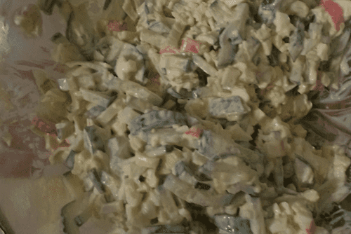 Cut cucumbers, crab sticks, and eggs into strips. Chop the onion finely.
