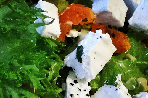 Cut Serbian cheese into cubes and place it on top of the salad.