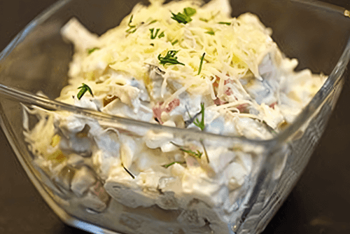 Salad with chicken, ham, and sour cream is a true celebration of flavor, embodying the harmony of softness and richness. This dish is part of Russian cuisine, where hearty and easy-to-make salads are valued. The combination of tender chicken breast, salty ham, fresh vegetables, and tangy pickles creates a delightful palette of tastes. The sour cream used as a dressing adds creaminess and a slight tanginess to the salad, while cheese and eggs provide textural depth. This salad is perfect for family lunches, festive gatherings, or just a pleasant dinner. It can be served mixed or layered for an impressive culinary presentation. The simplicity of preparation and availability of ingredients make this salad a favorite among hosts who appreciate cozy and delicious dishes.