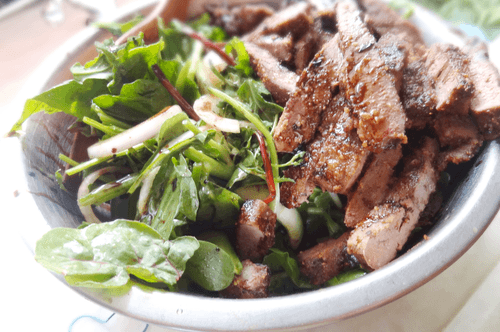 Rustic green salad with beef liver and truffle oil