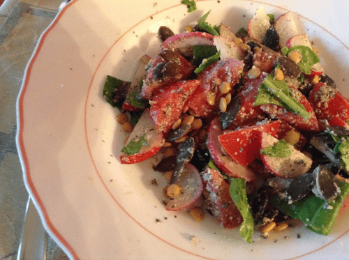 Vegetable raw salad with raisins is a bright and fresh recipe that offers true enjoyment of natural flavors. Its roots go back to the traditions of Russian cuisine, where the simplicity and benefits of fresh products are valued. Crunchy radish, juicy tomato, and tender spinach harmoniously combine to create a light and refreshing texture. Added pumpkin seeds provide a nutty note, while raisins bring pleasant sweetness, balancing the flavor nuances. This salad not only pleases the eye but also provides an energy boost, making it an excellent choice for healthy eating. It can be served as a standalone dish or a light addition to the main menu.