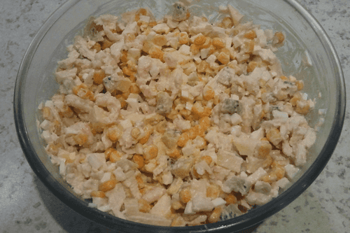 Mix fillet, shrimp, corn, eggs, apples, and kiwi. Dress with mayonnaise.