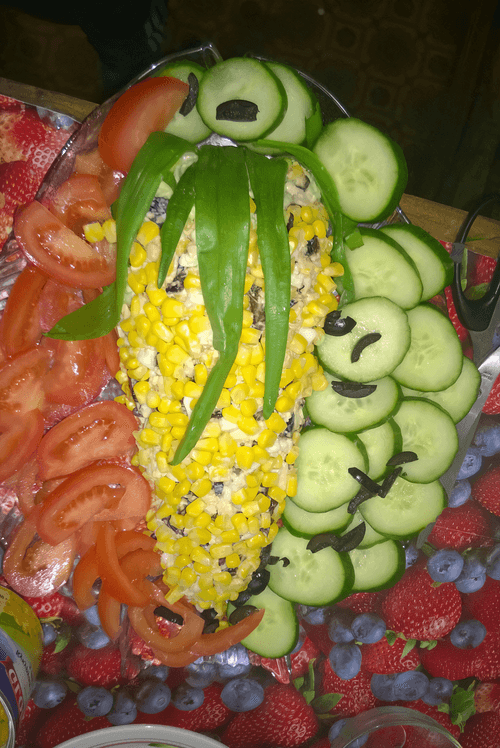 We arrange it in the form of a cob. If there's time, we carefully distribute the remaining corn over the salad (it can also be pressed down chaotically to hold well).