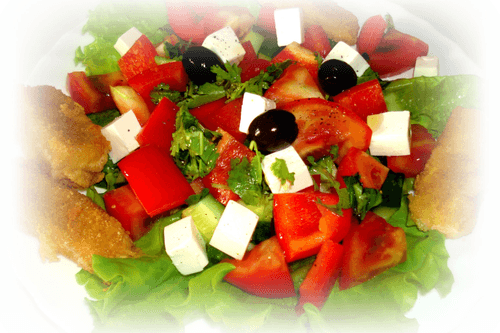 Greek salad with fried cheese is a refined version of the classic dish, giving it a special character. The roots of this recipe go back to sunny Greece, where fresh vegetables, cheese, and aromatic spices create the perfect harmony of flavors. Crispy lettuce leaves combine with juicy tomatoes, fresh cucumbers, and sweet peppers, while tangy salad onions and herbs add freshness. But the main highlight is the crispy fried cheese covered in a golden crust. The cornmeal coating with dried garlic gives it a subtle spicy aroma, while olive oil and lemon juice finish the composition with a light tanginess. The salad is perfect as a light main dish or an elegant appetizer that can adorn any table. Enjoy its unique Mediterranean flavor!