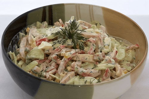 Mix everything, add corn and mayonnaise. Optionally, you can add finely chopped dill.