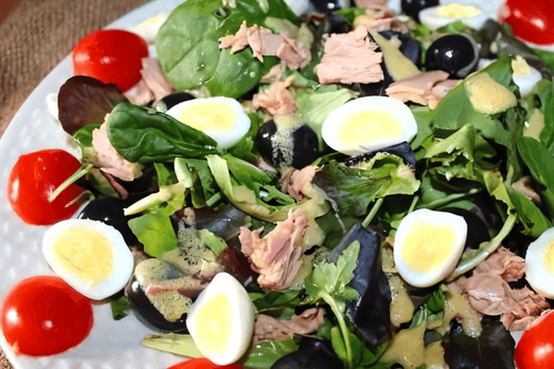 This exquisite salad combines the rich flavor of canned tuna, the tenderness of quail eggs, and the spiciness of pickled gherkins. European cuisine is renowned for its harmony of textures and balance of flavors, and this salad is a vivid representative. Crispy croutons add contrast, while olives bring a slight saltiness. Dressed with olive oil, it remains light and fresh, perfect as a standalone dish or a side to fish and white wine. The garnish of basil, sesame seeds, and tomatoes makes it not only a gastronomic delight but also an aesthetic pleasure. Quick to prepare, it will be an excellent choice for dinner or a festive table, highlighting the simplicity and elegance of European culinary art.