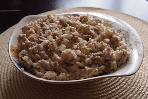 Salad with cod, onion, and egg is a simple yet exquisite representative of Russian cuisine, distinguished by its rich flavor and texture. Smoked cod gives it a deep aroma with a slight saltiness that harmonizes with the freshness of the onion and the tenderness of the boiled egg. Mayonnaise binds the ingredients into a creamy mass, creating a rich yet balanced taste. This salad can serve as both an independent dish and a wonderful addition to a festive table. Its roots trace back to traditional fish appetizers from northern regions of Russia, where smoked fish has always been an important part of the diet. It pairs especially well with black bread or potatoes, enhancing its cozy and rich character.