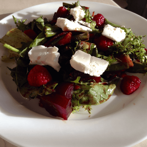 Salad with baked beets and goat cheese under raspberry-balsamic sauce