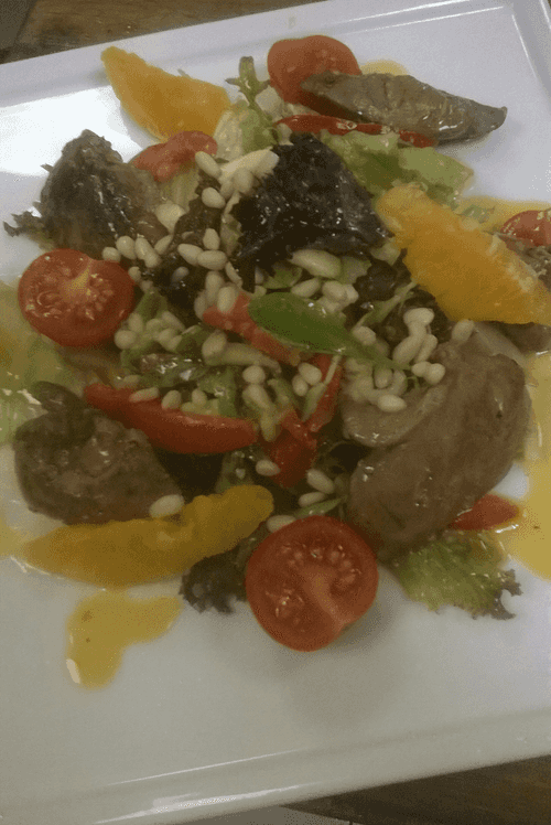 Warm salad of rabbit liver and avocado with passion fruit sauce