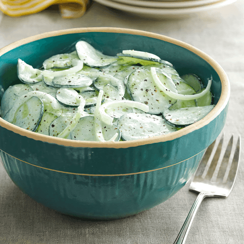 Cottage salad with young cucumbers is a refreshing dish that brings the taste of a summer garden to your table. Inspired by simple rural recipes from Europe, this salad combines delicate farmer's sour cream with the light tang of apple cider vinegar, creating a harmony of flavors. Young cucumbers add a crunchy freshness to the salad, while white onion adds a mild spiciness. Sugar and freshly ground black pepper balance the flavor palette, making the dish tender yet expressive. The salad is chilled before serving, making it especially enjoyable on warm days. An ideal option for a light summer lunch or as an accompaniment to main dishes at the cottage.