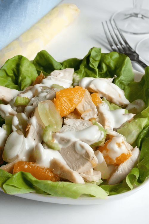 This exquisite Italian chicken salad with orange and grapes is a harmony of flavors and textures. Juicy orange, tender chicken breast, and refreshing grapes create a delightful duet of sweetness and tanginess, while crunchy celery adds freshness. The dressing made from natural yogurt with honey and mustard gently unites all the ingredients, making the dish light and airy. The origins of such combinations trace back to Mediterranean culinary traditions where freshness was always valued. This salad is perfect for a summer lunch or festive dinner, pleasantly surprising guests with its unusual mix of fruits and meat. Serving it on crisp iceberg lettuce leaves adds freshness and structure, turning the salad into a true culinary masterpiece.