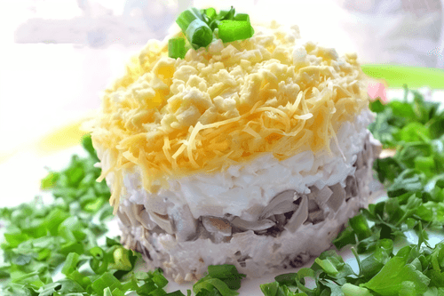 Layer from bottom to top: meat, mushrooms, mayonnaise, egg whites, mayonnaise, cheese, mayonnaise, egg yolks. Garnish with greens.