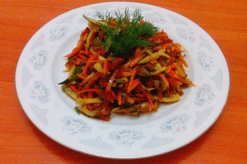 Eastern salad is a true embodiment of the flavors of Arab cuisine, combining the spiciness of spices, the freshness of vegetables, and the richness of meat notes. This salad originates from traditional Middle Eastern recipes where simple ingredients come together in a harmonious and hearty dish. Fried ground beef infused with coriander and black pepper aromas creates a rich base, while fresh cucumbers and carrots add crunch and lightness. Tomato paste provides a pleasant tanginess, and garlic and herbs complete the flavor symphony. An ideal option for serving warm or chilled, it works well as a standalone dish or an accompaniment to meat delicacies. The salad not only delights with its flavor nuances but also brings gastronomic pleasure with an Eastern flair.