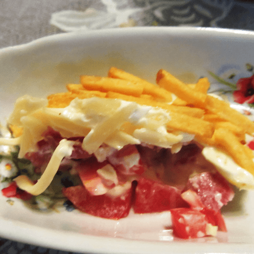 Potato salad is a vibrant combination of crunchy textures and rich flavors that captivates from the first bite. Its roots trace back to home European cuisine, where simple ingredients transform into culinary masterpieces. The main focus is on crispy potatoes fried to a golden crust, complemented by tender boiled meat, juicy tomatoes, and zesty garlic mayonnaise. Thin layers of cheese add creaminess to the dish, while soaking makes it particularly rich. This salad is perfect for both festive tables and cozy family dinners. It can be served chilled or at room temperature, allowing the flavors to harmoniously unfold. An excellent option for lovers of contrasting textures and a rich bouquet of aromas.