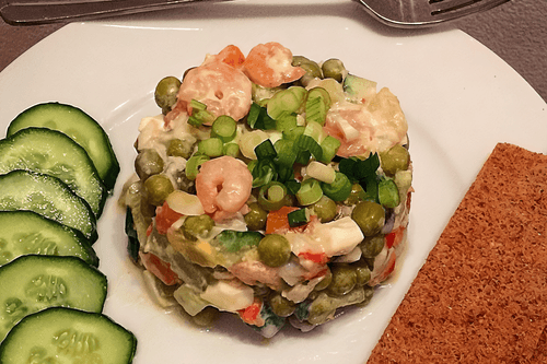 Dietary 'Olivier' with seafood and sour cream is an elegant interpretation of the classic Russian salad, adapted for those mindful of their diet. In this version, traditional meat ingredients are replaced with tender crab meat and juicy shrimp, giving the dish a refined marine flavor. A light sour cream dressing makes the salad airy and fresh, while the absence of salt allows the natural flavors of the ingredients to shine through. Quail eggs, potatoes, and carrots create a soft texture, while pickles and green peas add crunch. Garnished with green onions and shrimp, this 'Olivier' is a wonderful choice for a light dinner or festive table, combining tradition with a modern approach to healthy eating.