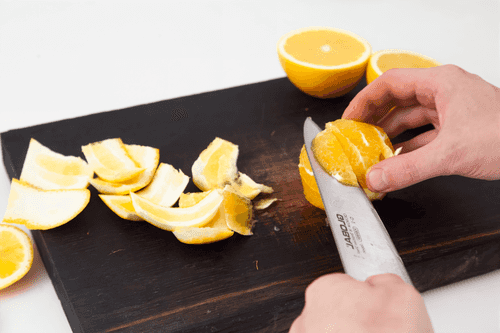 Cut the orange into segments without membranes, then blend the second juice with oil, adding salt and pepper.